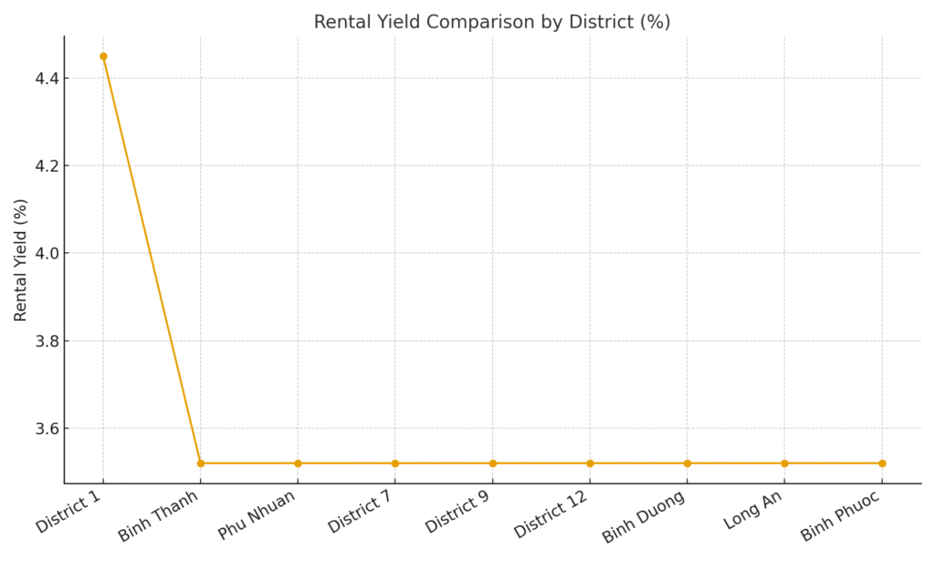 | 平盛郡(Bình Thạnh) | VND 77,100,000 | ~$2,949 | 3.52% | Saigon Pearl: ~$164,851 |