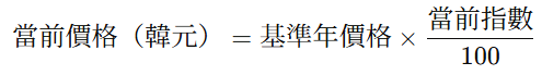 在韓國官方統計中,類似的公寓價格指數(Apartment Price Index, API)通常以基準年 = 100 的指數表示房價漲跌情況,而非實際韓元價格。例如: